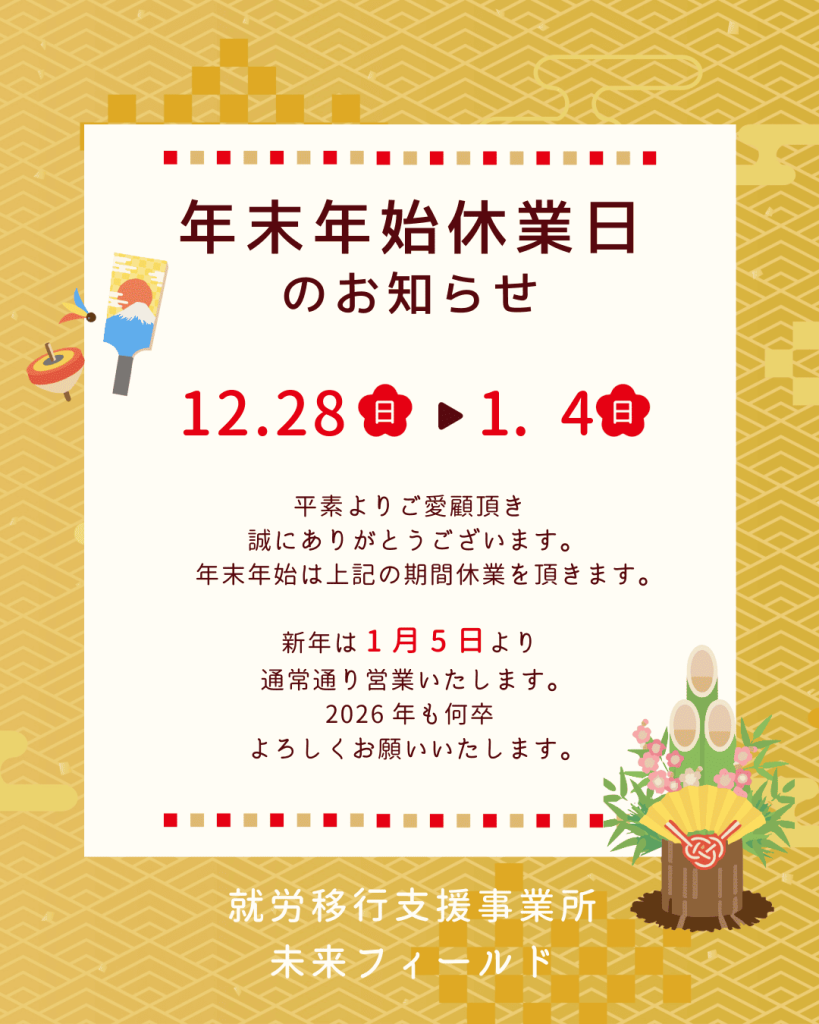 【お知らせ】2025~2026 年末年始休業日のご案内 2025年12月25日 最終更新日時 : 2025年12月25日 mirai-field 下記日程におきまして、年末年始の休業をいただいております。ホームページよりお問い合わせをいただいた際は、折り返しのご連絡が1月5日以降になります。どうぞご了承ください。 Follow me! @mirai_field X